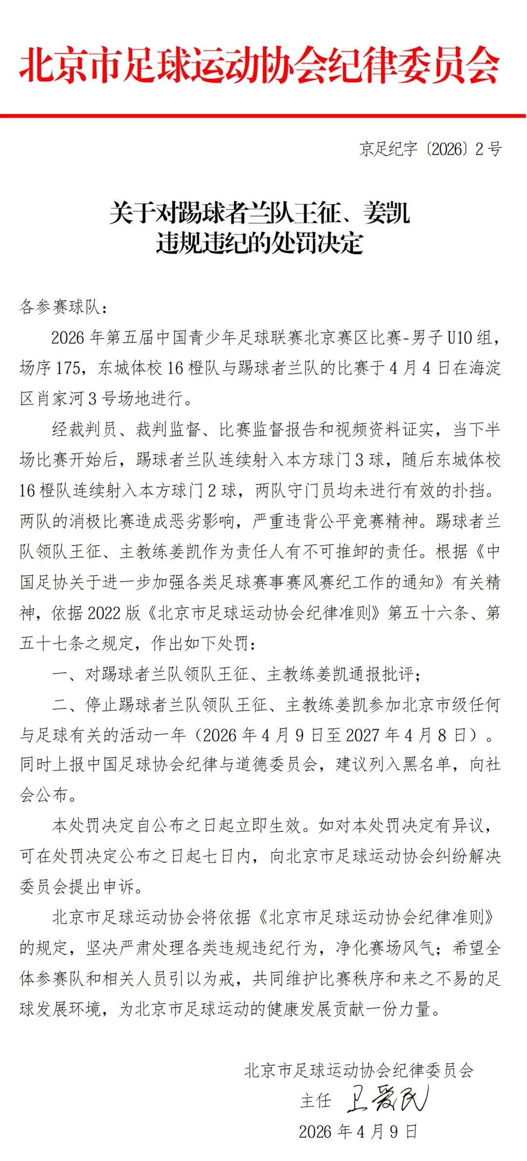 4月9日,北京足协发布四条处罚决定,对中青赛北京赛区U10组东城体校16橙队和踢球者兰队在比赛中互射本方球门的行为处以取消赛事资格,两队领队及主教练均被禁赛一年。