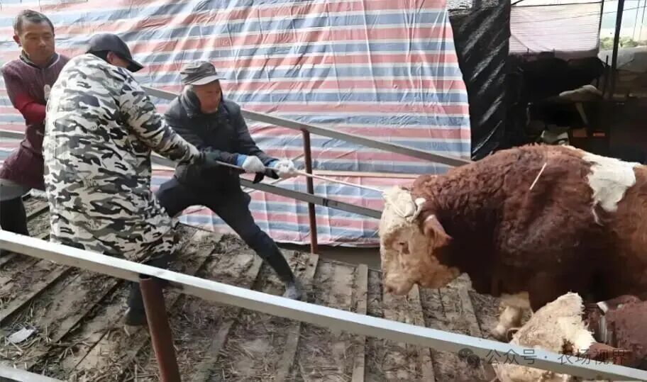 工人们拉着牵引绳正将一头头肉牛稳步引上货车