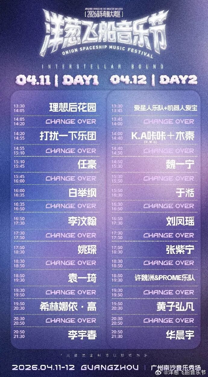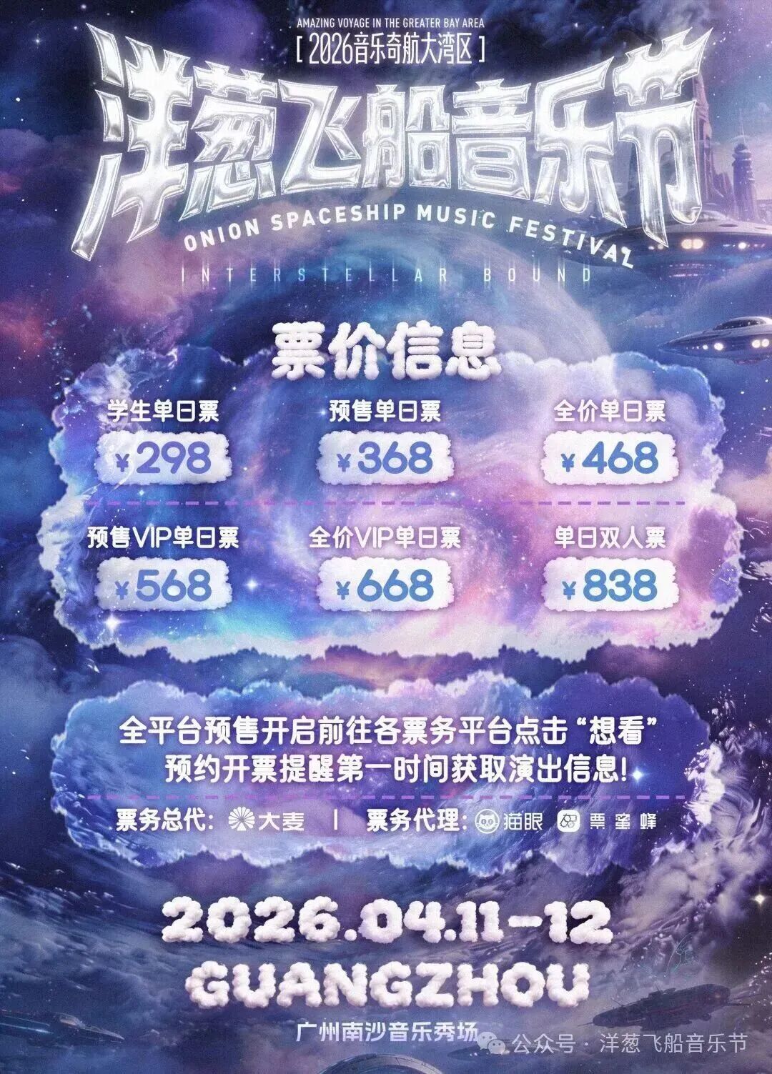 主办方发布的公告称,经多方审慎评估与协商,原定于2026年4月11日至12日在广州举办的“2026洋葱飞船音乐节”因故推迟。
