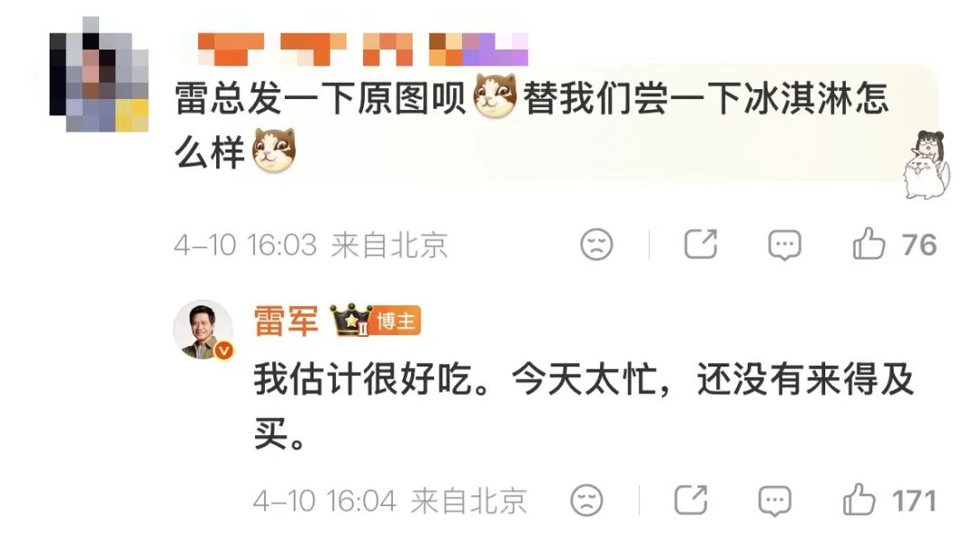 有网友问雷军冰淇淋味道如何,他表示:“我估计很好吃,今天太忙,还没有来得及买。”