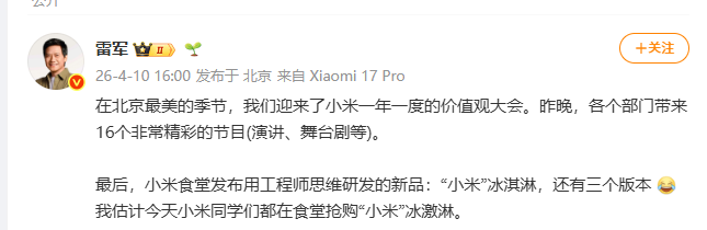 有小米员工在社交平台分享称,这款冰淇淋上还撒了小米,很好吃。