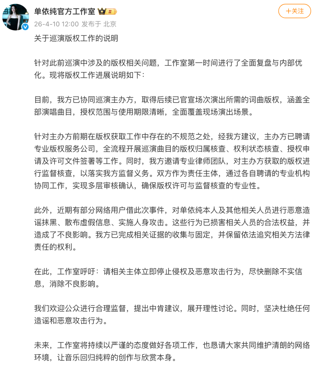 今天(4月10日),@单依纯官方工作室 发布关于巡演版权工作的说明。全文如下: