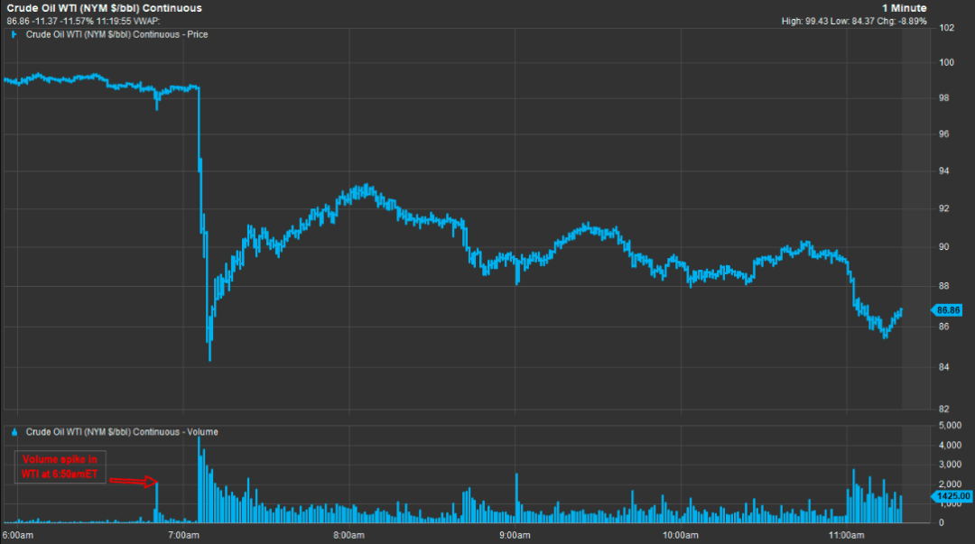 而就在此前一天(3月23日),美国总统特朗普曾通过社交平台Truth Social宣布了延后对伊军事打击的决定。但诡异的是,在这一政策突然转变前的约15分钟,期货市场和预测市场就率先出现了一波神秘的交易热潮。据道琼斯市场数据显示,当时不到两分钟内,价值超过7.6亿美元的原油期货合约易手。