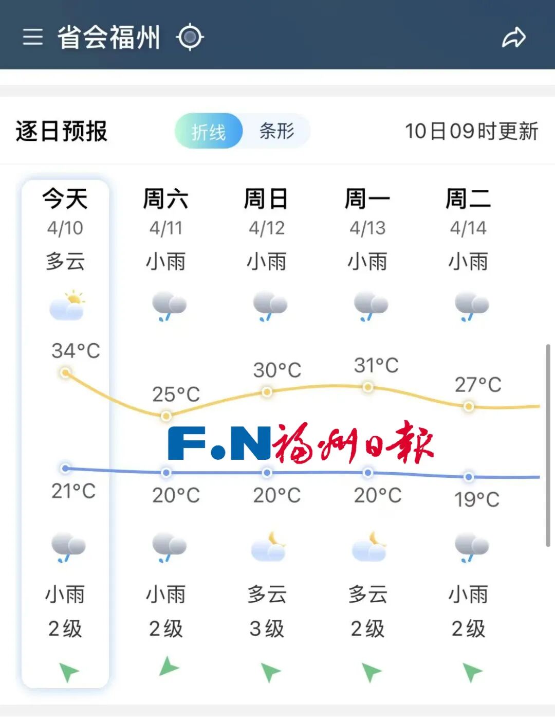 据福州气象,锋面靠近,福州处于锋面南侧暖空气控制下,今天福州各地多云,傍晚到夜里部分地区有阵雨或雷阵雨。白天全市大部地区最高气温在30℃~36℃左右,福州主城区最高气温在34℃左右,不排除出现35℃高温,体感炎热。