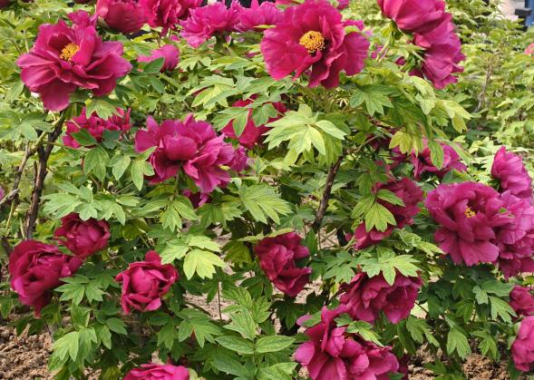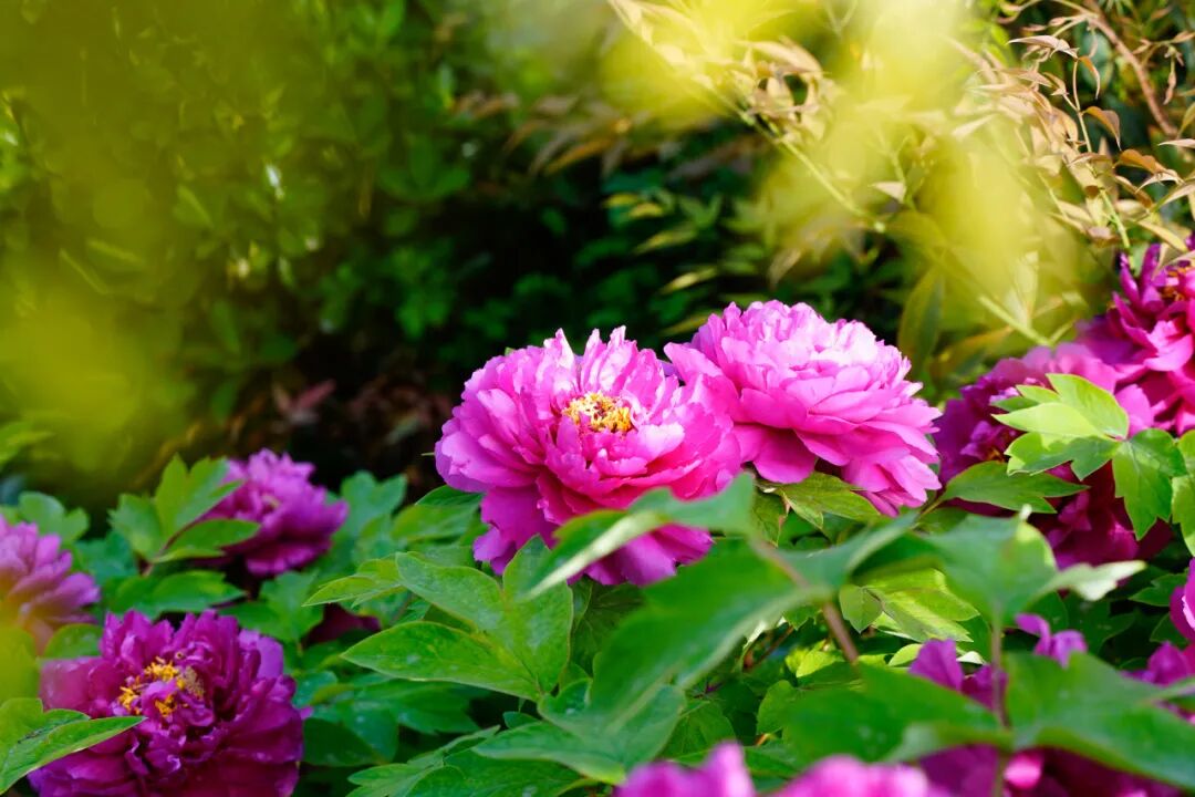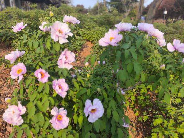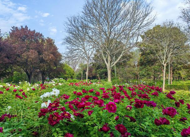 全园约有30个品种牡丹,主要分布在白鹤卧雪广场、紫根广场、春归花屋。盛开的牡丹品种有黑海撒金、洛阳红等。