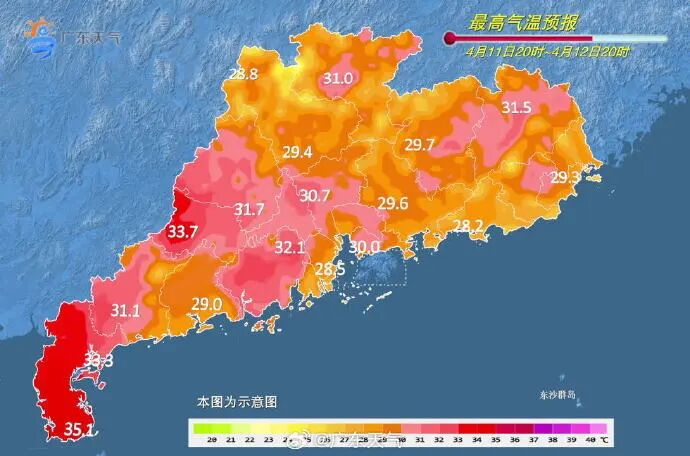 11-12日,韶关、清远、肇庆北部市县多云到阴天,有(雷)阵雨局部大雨,其余市县多云间阴天,局部有(雷)阵雨,早晚有轻雾或雾。白天最高气温:雷州半岛34~36℃,南部沿海市县28~30℃,其余市县30~34℃。