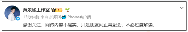 @黄景瑜工作室 发文回应:“感谢关注,网传内容不属实,只是朋友间正常聚会,不必过度解读。 ”