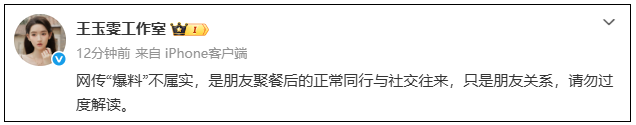 @王玉雯工作室 发文回应:“网传‘爆料’不属实,是朋友聚餐后的正常同行与社交往来,只是朋友关系,请勿过度解读。”