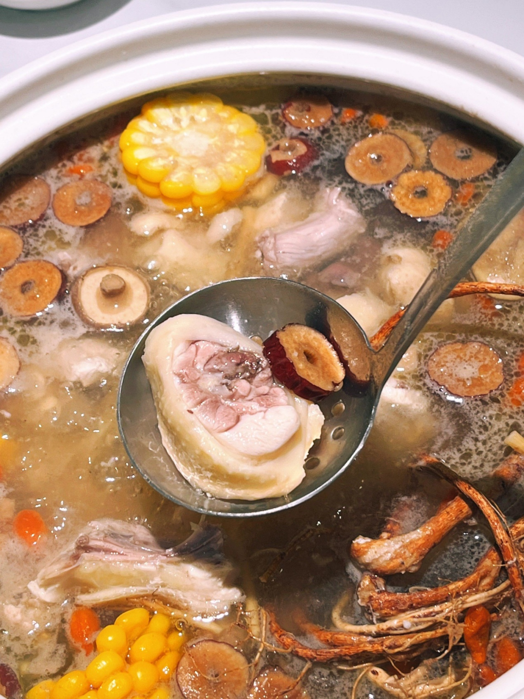 (4)大火烧开后撇净浮沫,转小火慢煲1.5小时,至鸡肉酥烂、汤色金黄清润、香气馥郁。