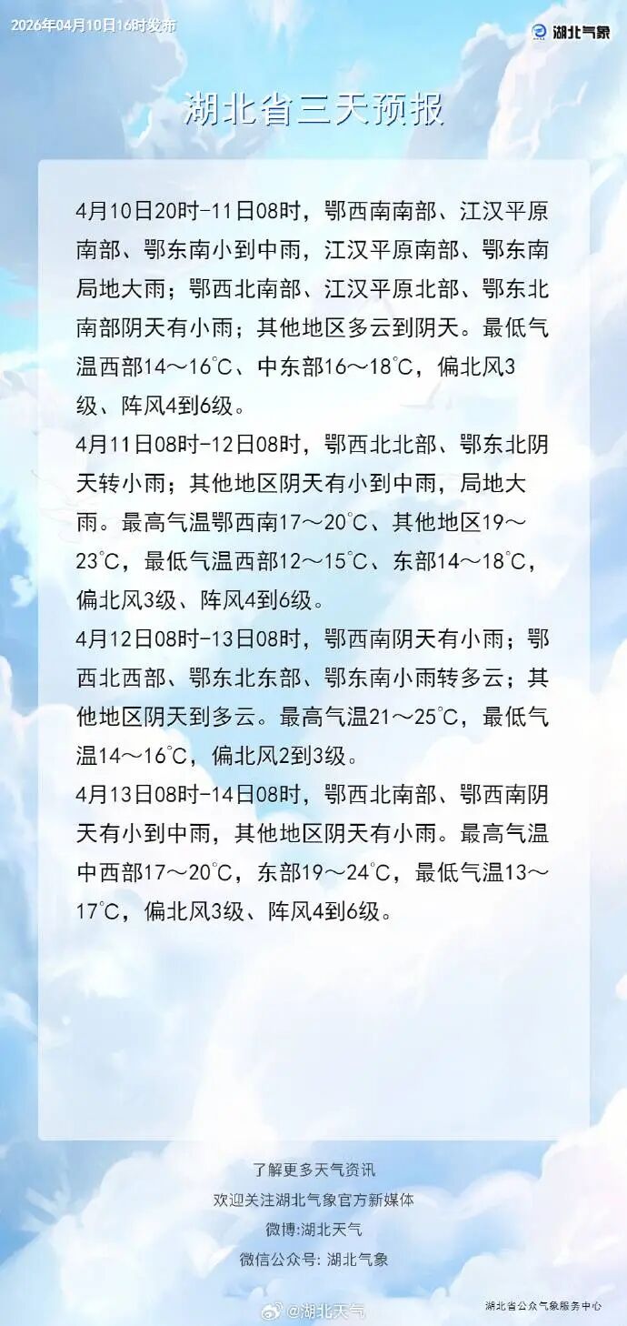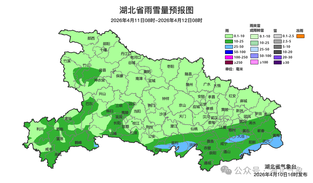 4月10日晚,湖北省自然资源厅和湖北省气象局联合发布地质灾害蓝色预警。2026年04月10日20时-2026年04月11日20时,预计宜昌(长阳土家族自治县北部和南部、五峰土家族自治县大部)、黄石(阳新县西南部)、咸宁(通山县南部、崇阳县东部)以及其他强降水区域发生崩塌、滑坡、泥石流的风险较高。请相关地方政府及有关部门按照《湖北省地质灾害防范规程》和预警响应工作方案做好地质灾害防范工作。
