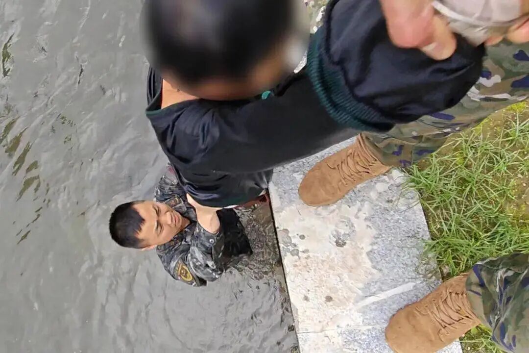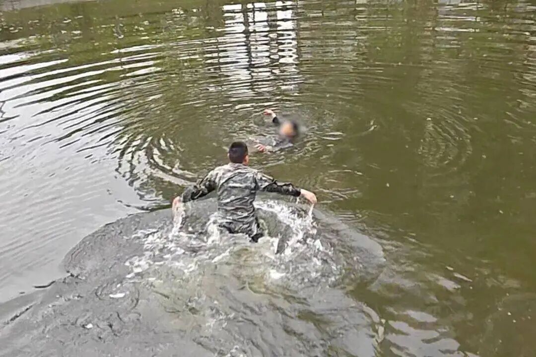 来不及半点犹豫,水性较好的陈森直接跳入河中,奋力向落水者游去。岸边上,另一名战士王正军时刻接应、全力配合。