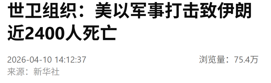 新华社北京4月10日电 世界卫生组织9日发布的数据显示,自2月28日以来,美国和以色列对伊朗的大规模军事打击已导致伊朗近2400人死亡、超过3.2万人受伤,另有320万人流离失所。