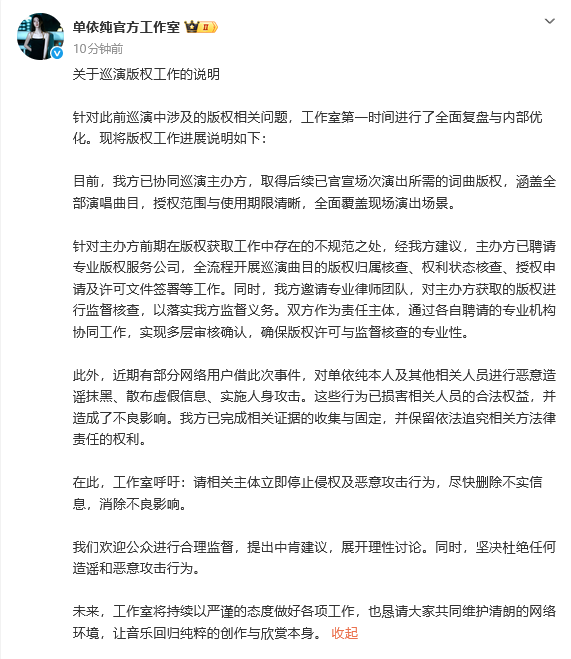 刚刚,单依纯官方工作室发布“关于巡演版权工作的说明”: