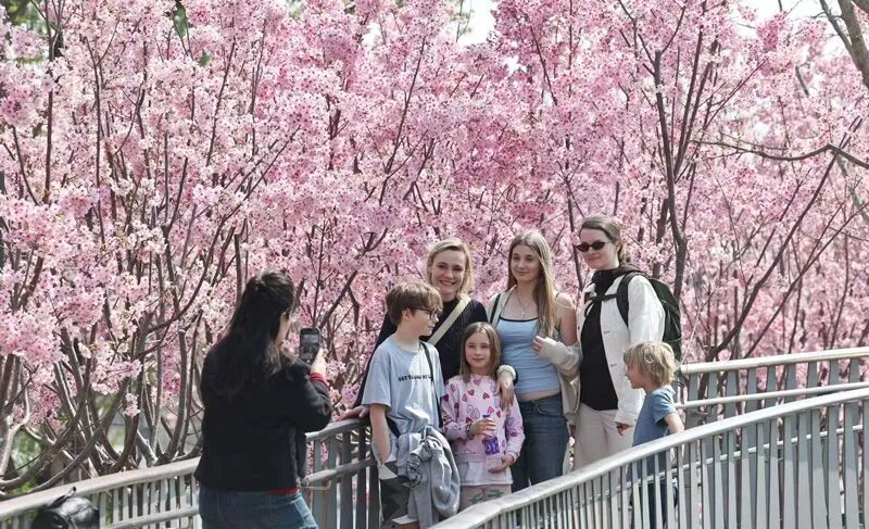 “游客可以根据自己喜欢的花型决定什么时候来园赏花。”胡娜说,和早樱单瓣、花朵小巧不同,晚樱为重瓣花朵,层层叠叠,近观如锦簇团花,远望似绯红云霞。