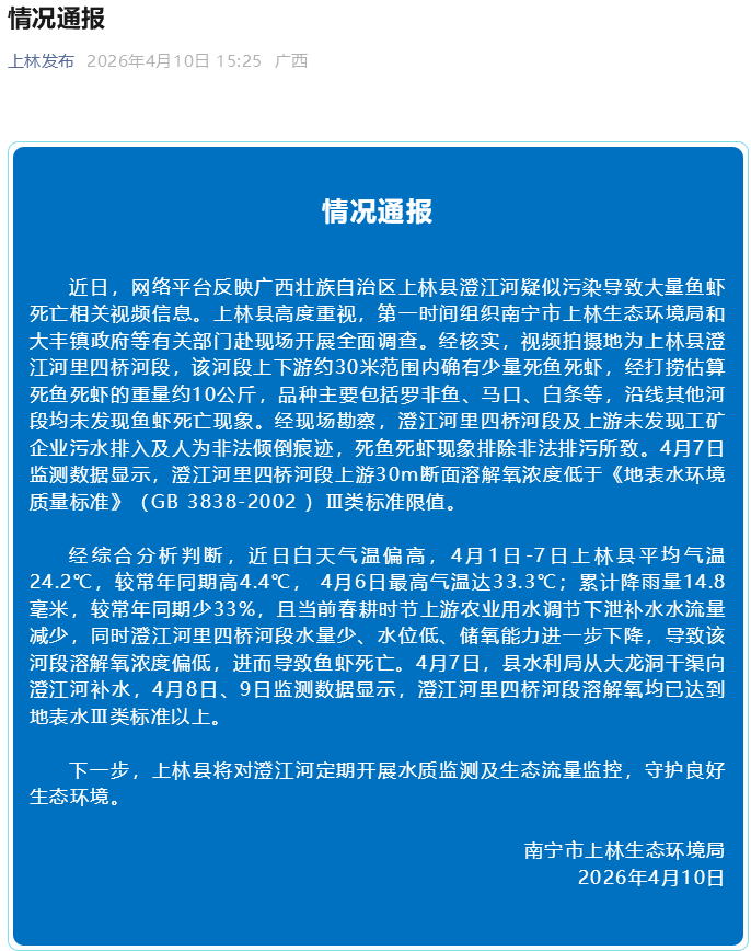 经综合分析判断,近日白天气温偏高,4月1日—7日上林县平均气温24.2℃,较常年同期高4.4℃, 4月6日最高气温达33.3℃;累计降雨量14.8毫米,较常年同期少33%,且当前春耕时节上游农业用水调节下泄补水水流量减少,同时澄江河里四桥河段水量少、水位低、储氧能力进一步下降,导致该河段溶解氧浓度偏低,进而导致鱼虾死亡。4月7日,县水利局从大龙洞干渠向澄江河补水,4月8日、9日监测数据显示,澄江河里四桥河段溶解氧均已达到地表水Ⅲ类标准以上。