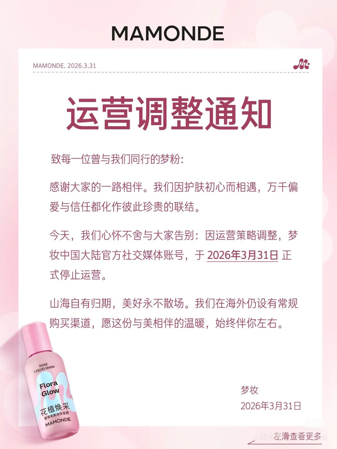 梦妆官方社交媒体账号已于3月31日停运,根据公告,线上官方渠道运营也将停止,相关店铺最晚于6月30日彻底关闭,会员的储值余额将全部退款。