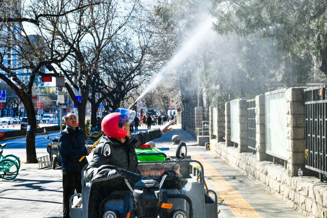 3月18日,北京市朝阳区三里屯街道,工作人员用高压水枪冲洗圆柏树冠,以抑制花粉扩散。