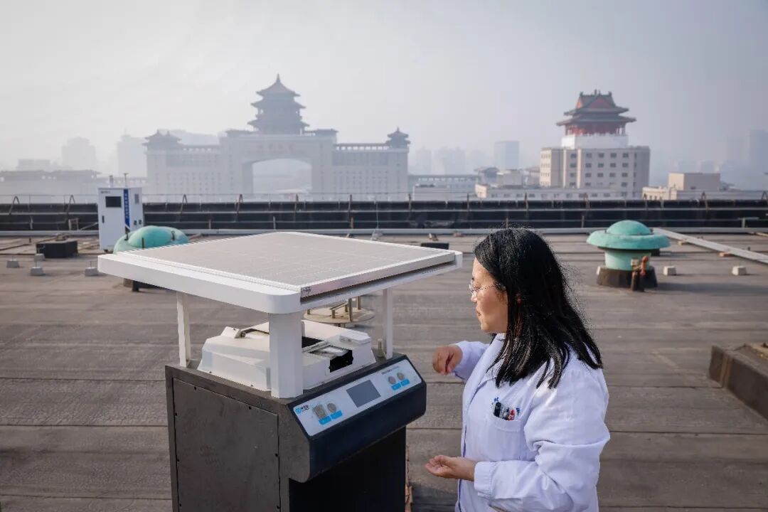 3月25日清晨,北京世纪坛医院变态反应中心花粉研究室花粉监测员宁慧宇在医院楼顶操作花粉收集器。