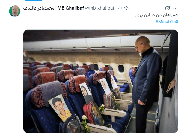 卡利巴夫当天在自己的社交媒体账号发了一张照片,并配文“我的飞行同伴们”“米纳卜168”。照片上的卡利巴夫一身正装,低头注视着客舱前排座椅。这些座椅上摆放着的是四名遇难儿童的相片和书包。