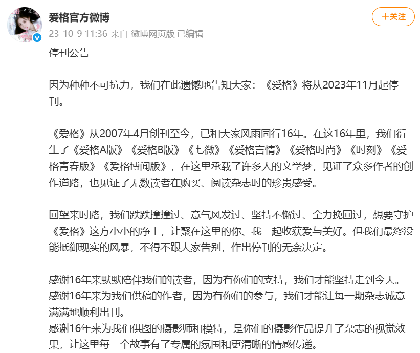 据悉,爱格曾在2023年10月9日发布停刊公告,称“因为种种不可抗力,我们在此遗憾地告知大家:《爱格》将从2023年11月起停刊。”