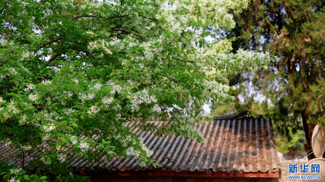 在昆明市石林彝族自治县圭山镇糯黑村,平均树龄超150年的107棵流苏古树冠盖如云,满树繁花悄然绽放,细碎洁白的花瓣宛如皑皑白雪覆盖枝头。