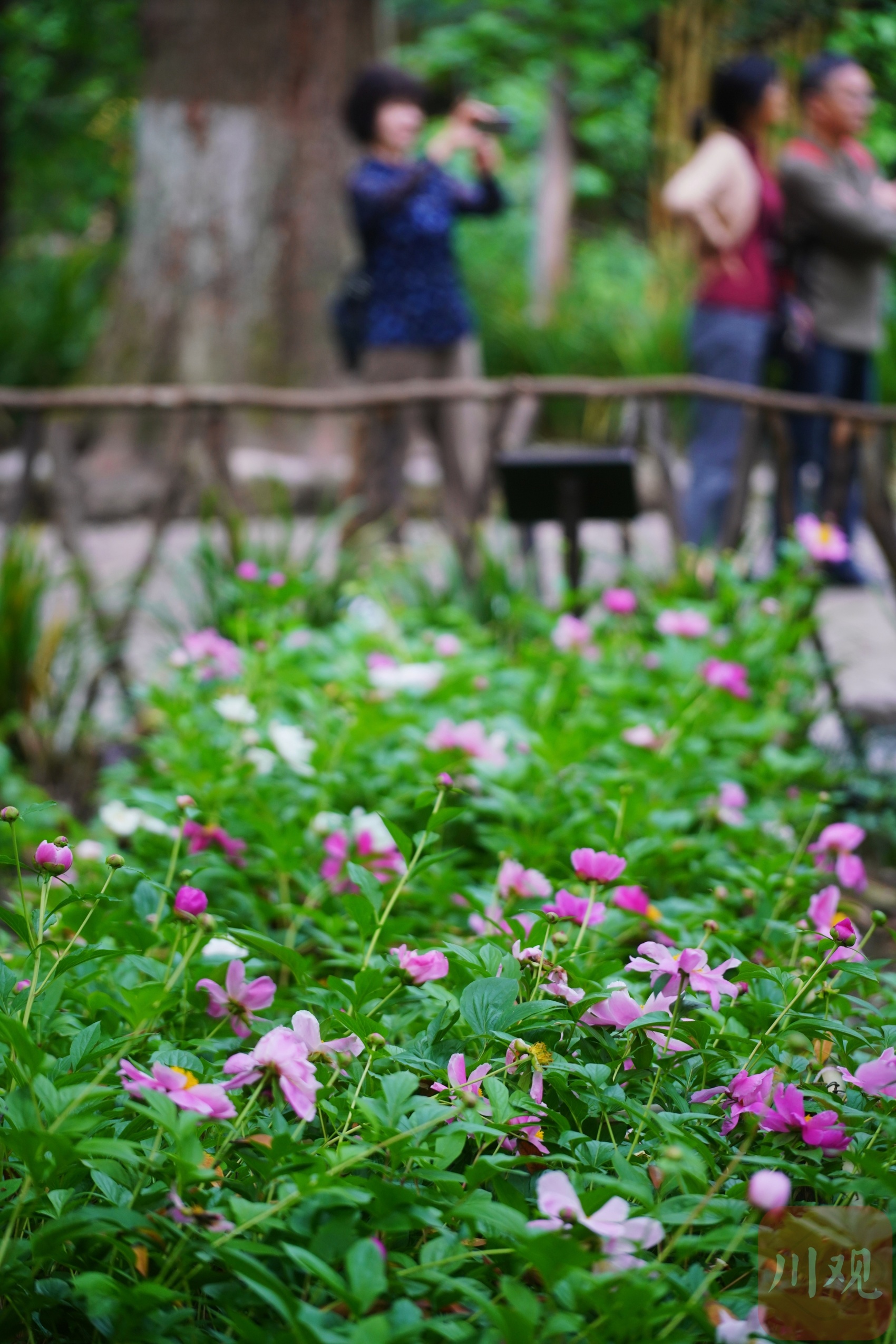 在药圃前芍药花已开放。