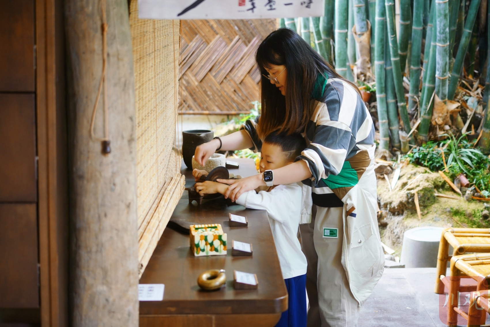 体验中药制作过程的游客。