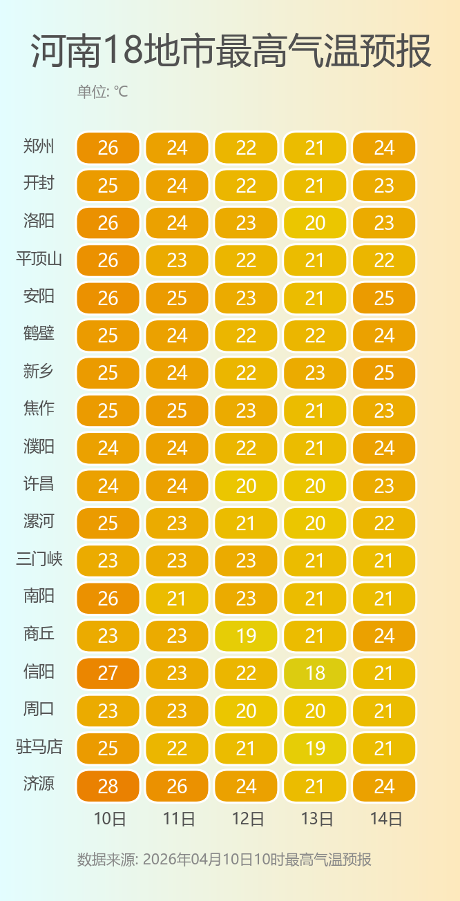 不过受弱冷空气影响,雨水带来的降温效应会在12日显现。今天开始到下周初,河南大部的最高气温小幅下降至20℃出头,有弱雨水现身的西部、南部也会多几分凉意。最低气温则变化不大,基本都维持在10~15℃之间,只穿单衣肯定扛不住阵阵凉意,早晚仍需添衣保暖。预计下周中后期,气温将步入新一轮上升通道,30℃+的最高气温已经蓄势待发,短袖可以提前备好了。