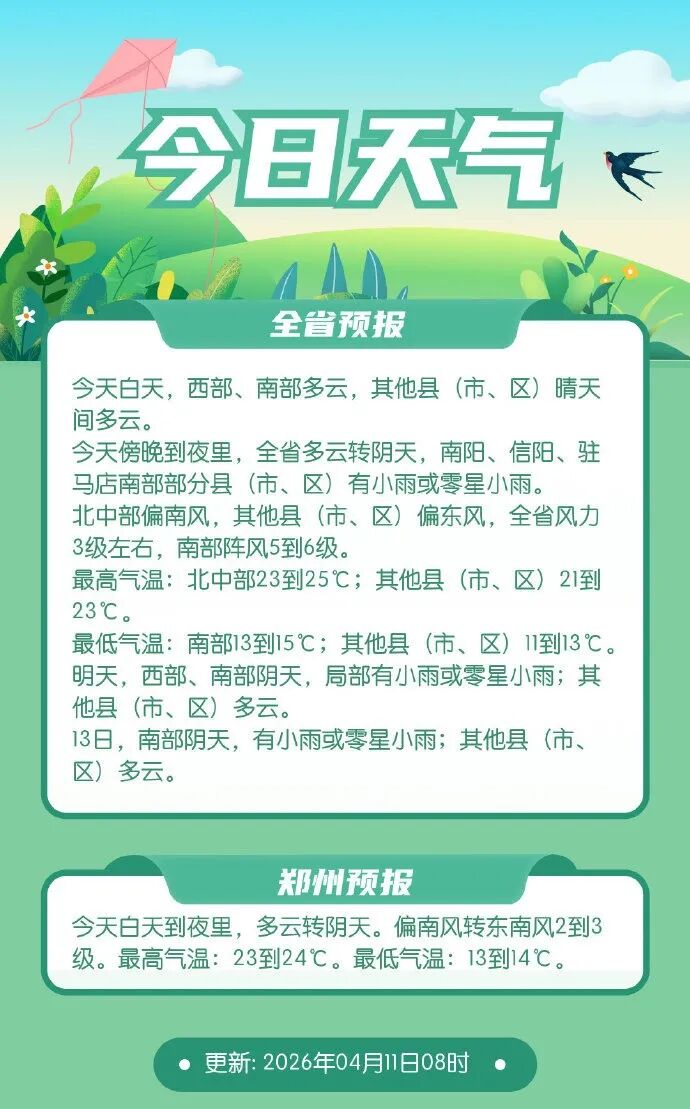 随着河南高空转为西北气流控制,未来四天,晴多雨少的天气格局将继续维持。今天傍晚到明天,西部、南部部分地区偶有小雨或零星小雨外,其余大多时段将以晴或多云天气为主。