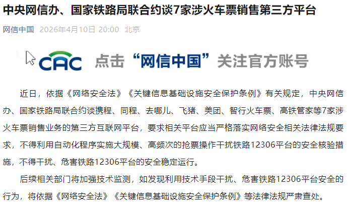 近日,依据《网络安全法》《关键信息基础设施安全保护条例》有关规定,中央网信办、国家铁路局联合约谈携程、同程、去哪儿、飞猪、美团、智行火车票、高铁管家等7家涉火车票销售业务的第三方互联网平台,要求相关平台应当严格落实网络安全相关法律法规要求,不得利用自动化程序实施大规模、高频次的抢票操作干扰铁路12306平台的安全核验措施,不得干扰、危害铁路12306平台的安全稳定运行。