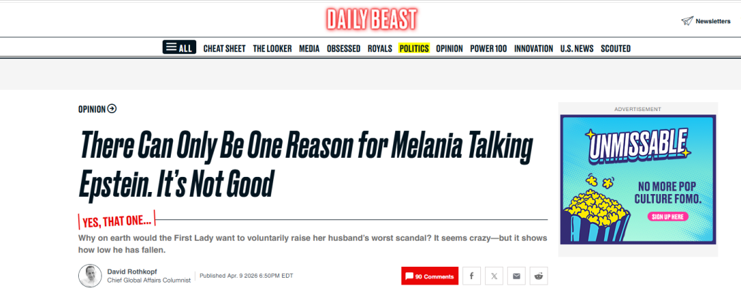 美国新闻网站《每日野兽》4月9日刊发题为《梅拉尼娅就爱泼斯坦案发声只有一个原因,这原因可不妙》的评论性文章,作者是大卫·罗斯科夫(David Rothkopf),文章摘编如下: