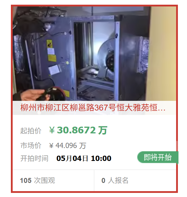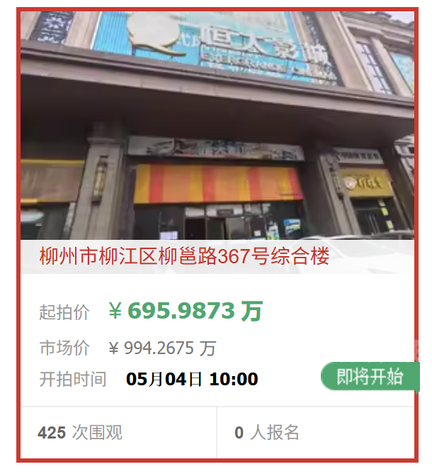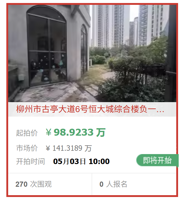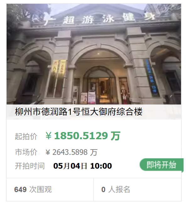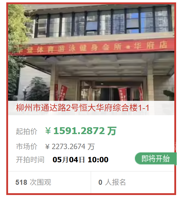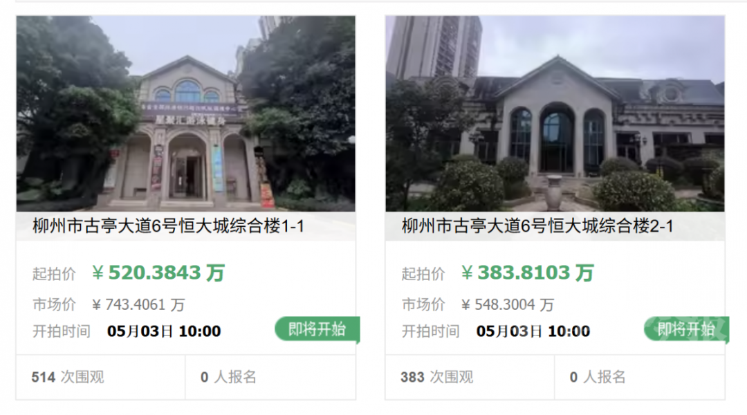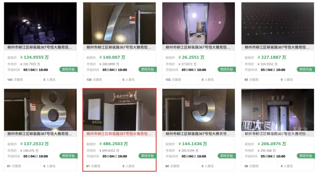 就在大家唏嘘不已时,记者了解到,恒大集团在柳州已上架阿里司法拍卖平台的不动产中,将于5月初开拍的不仅有位于柳邕路367号恒大雅苑的恒大影城,还包括位于古亭大道6号的恒大城综合楼、通达路2号恒大华府综合楼、德润路1号恒大御府综合楼等房产。