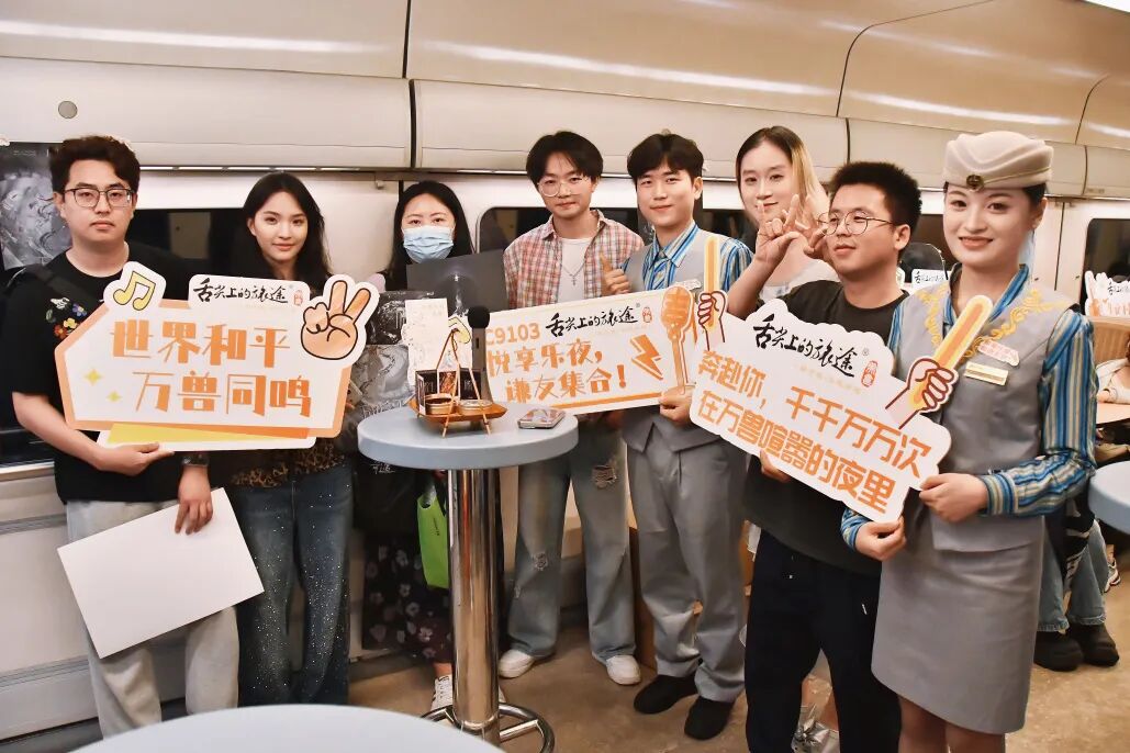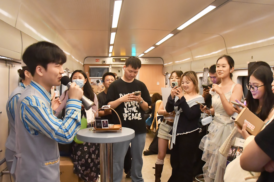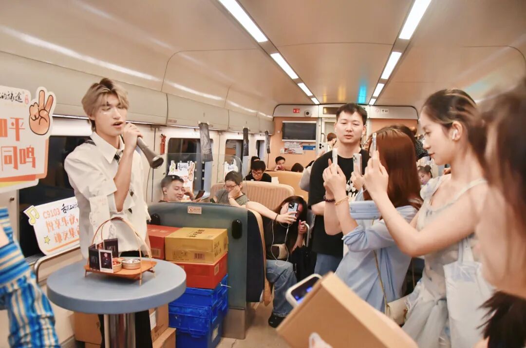 从演出精彩瞬间到各自珍藏的追星故事,乘务员带动旅客参与互动,车厢内欢声笑语不绝于耳。