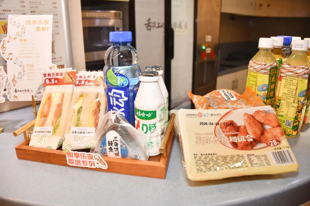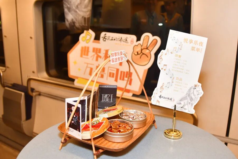 登上C9103次列车5号车厢,餐车已被精心布置为“能量补给站”:主题装饰点缀其间,专属菜单与各式餐食已“悉数就位”,列车整体延续了演唱会现场的欢乐氛围。
