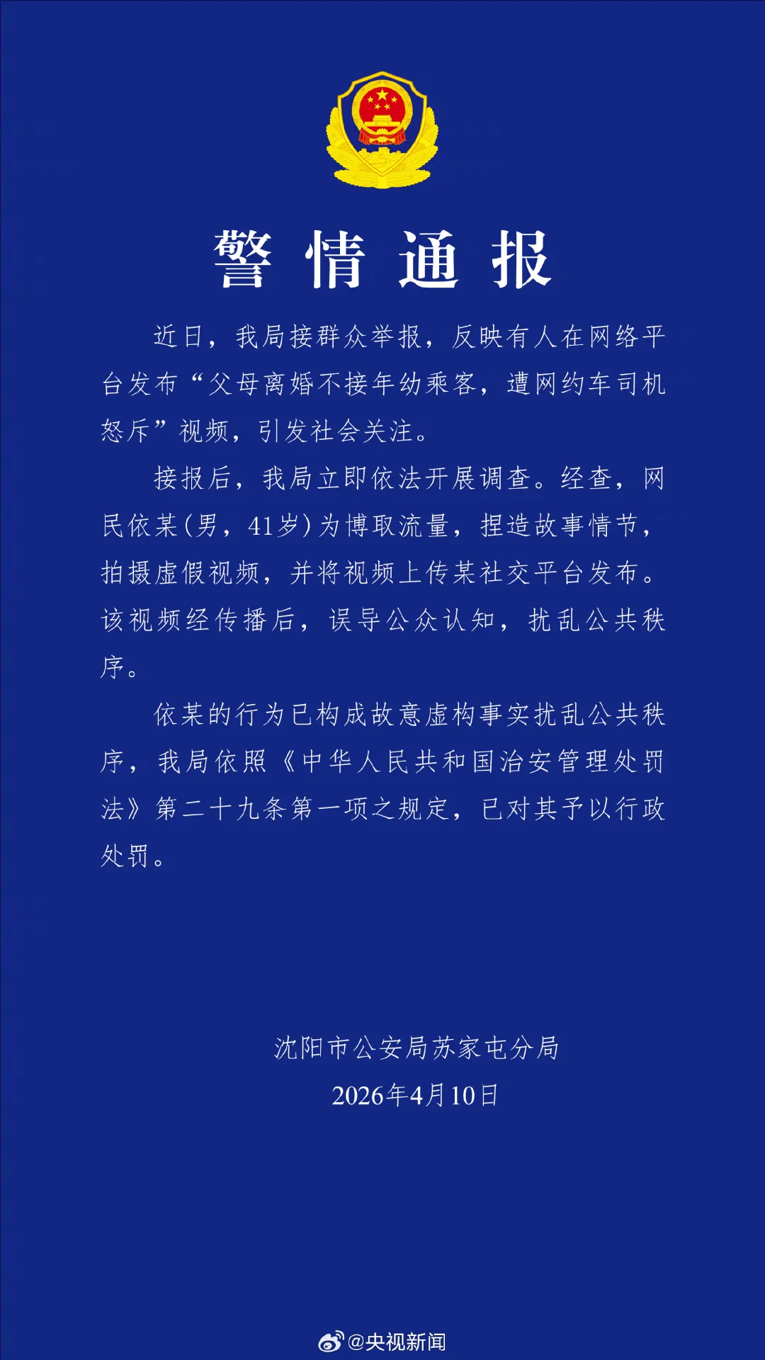 4月10日晚,辽宁沈阳市公安局苏家屯分局发布警情通报: