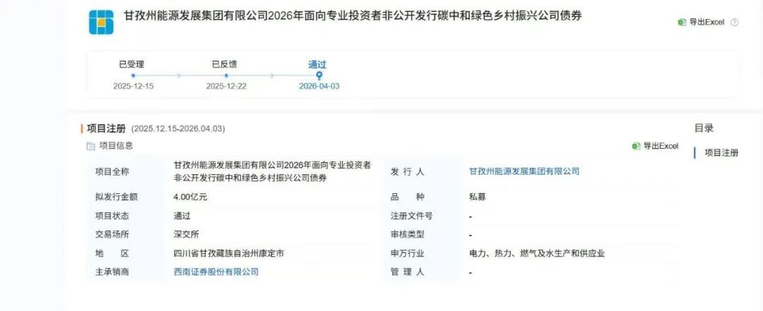 近日,甘孜州能源发展集团有限公司2026年面向专业投资者非公开发行公司债券获深圳证券交易所审核通过。本期债券系甘孜州首单交易所市场获批的公司债券,也是四川省首单同时贴标碳中和、乡村振兴的非公开发行公司债券,实现甘孜州国有企业资本市场直接融资跨越式突破。