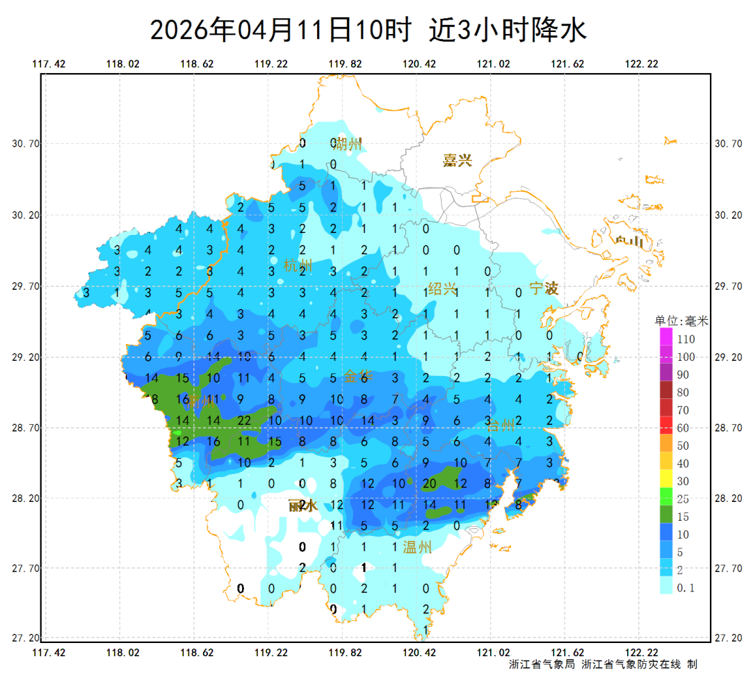 目前的降水范围正在逐渐朝北发展,局地雨势还是蛮大的,截至上午10时,近三小时累计降水最大出现在江山市的山底村站点,达到了30.3毫米。
