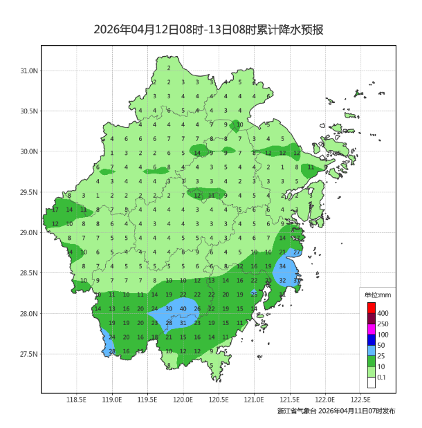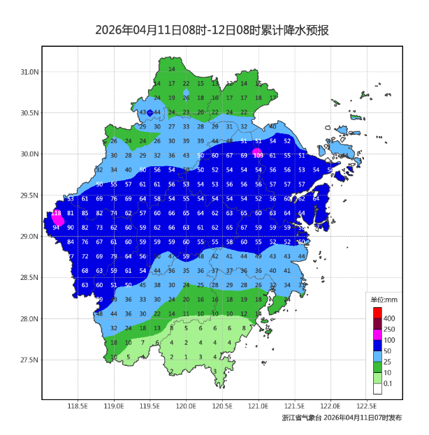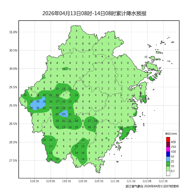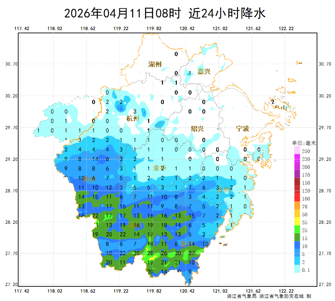 昨天主要在夜里,中南部出现雷雨并伴有短时强降水,泰顺、庆元局地暴雨,共有4个乡镇(街道)雨量超过50毫米,单站最大为泰顺县罗阳上稔垟58毫米,有40个乡镇(街道)小时雨强超过20毫米,最大为庆元县官塘乡43毫米;沿海海面和内陆部分地区出现雾。