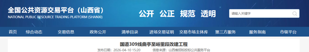 4月10日,从山西省公共资源交易平台传来消息,国道309线曲亭至峪里段改建工程招标已公示。项目总投资293534万元。