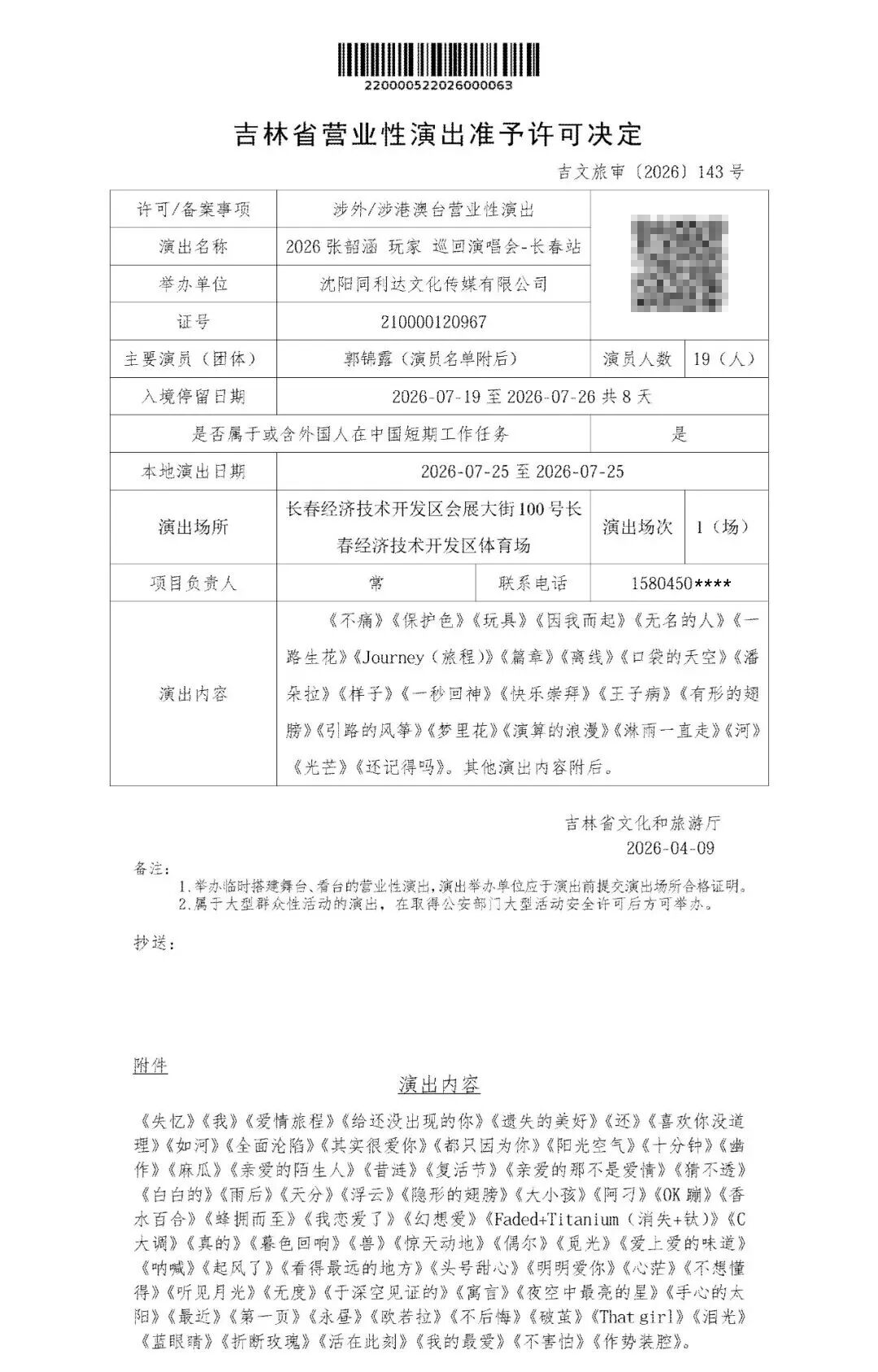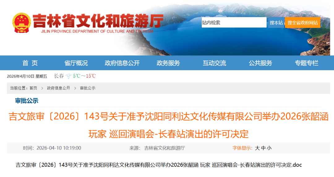 4月10日,吉林省文化和旅游厅网站发布《吉文旅审〔2026〕143号关于准予沈阳同利达文化传媒有限公司举办2026张韶涵 玩家 巡回演唱会-长春站演出的许可决定》。