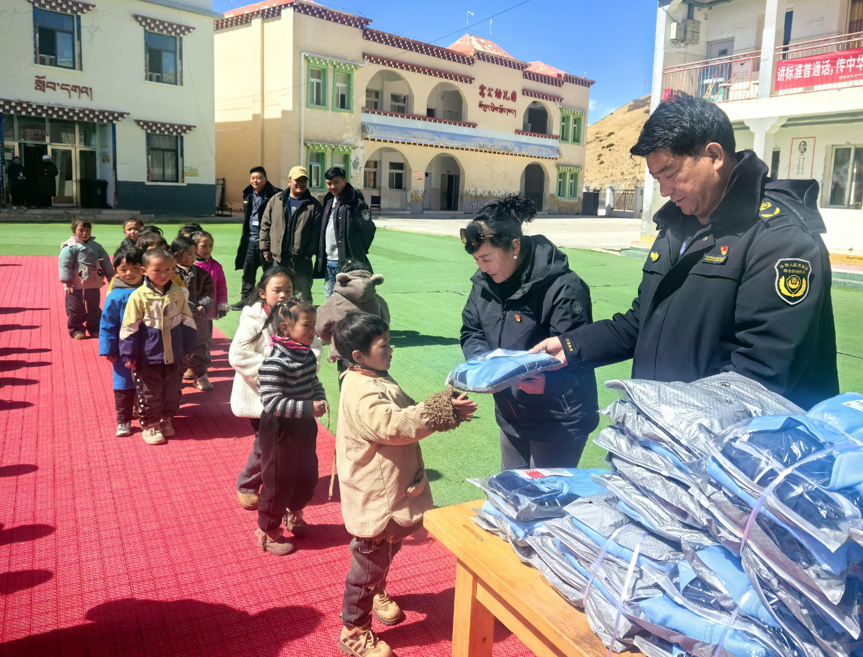 德格县政协委员、县政协副主席达瓦拥西为窝公中心小学发放校服。