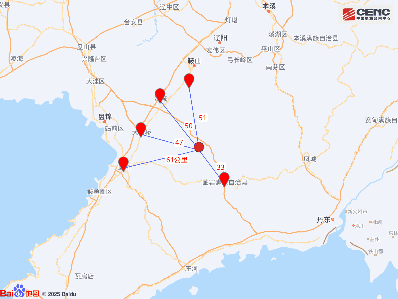 周边县城:震中距岫岩满族自治县33公里、距大石桥市47公里、距海城市50公里、距千山区51公里、距盖州市61公里,距鞍山市65公里,距沈阳市149公里。