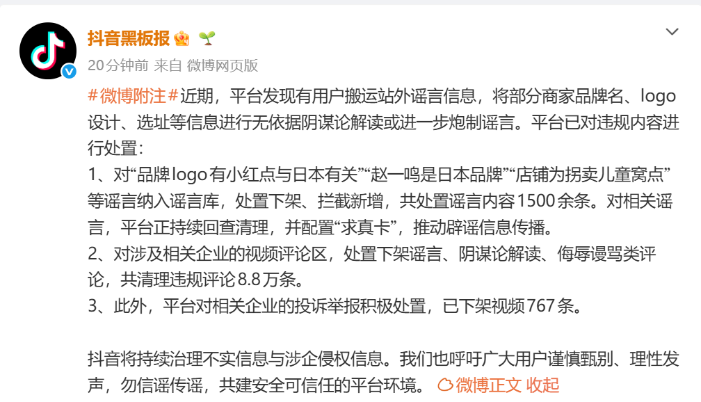 抖音将持续治理不实信息与涉企侵权信息。我们也呼吁广大用户谨慎甄别、理性发声,勿信谣传谣,共建安全可信任的平台环境。