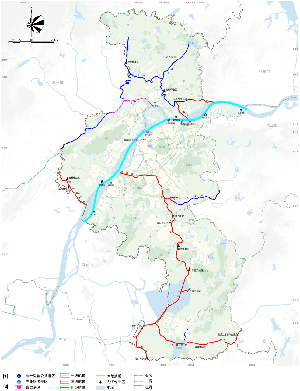 依托长江南京以下12.5米深水航道,优化港口布局,形成“6个综合运输公共港区+3个临港工业港区+4个客运港区”的整体格局,进一步提升龙潭、西坝等港口作为国家物流枢纽的重要地位。打造以长江航运为骨干,芜太运河、秦淮河、滁河等内河航运为补充的水上运输体系,畅通水路运输脉络。