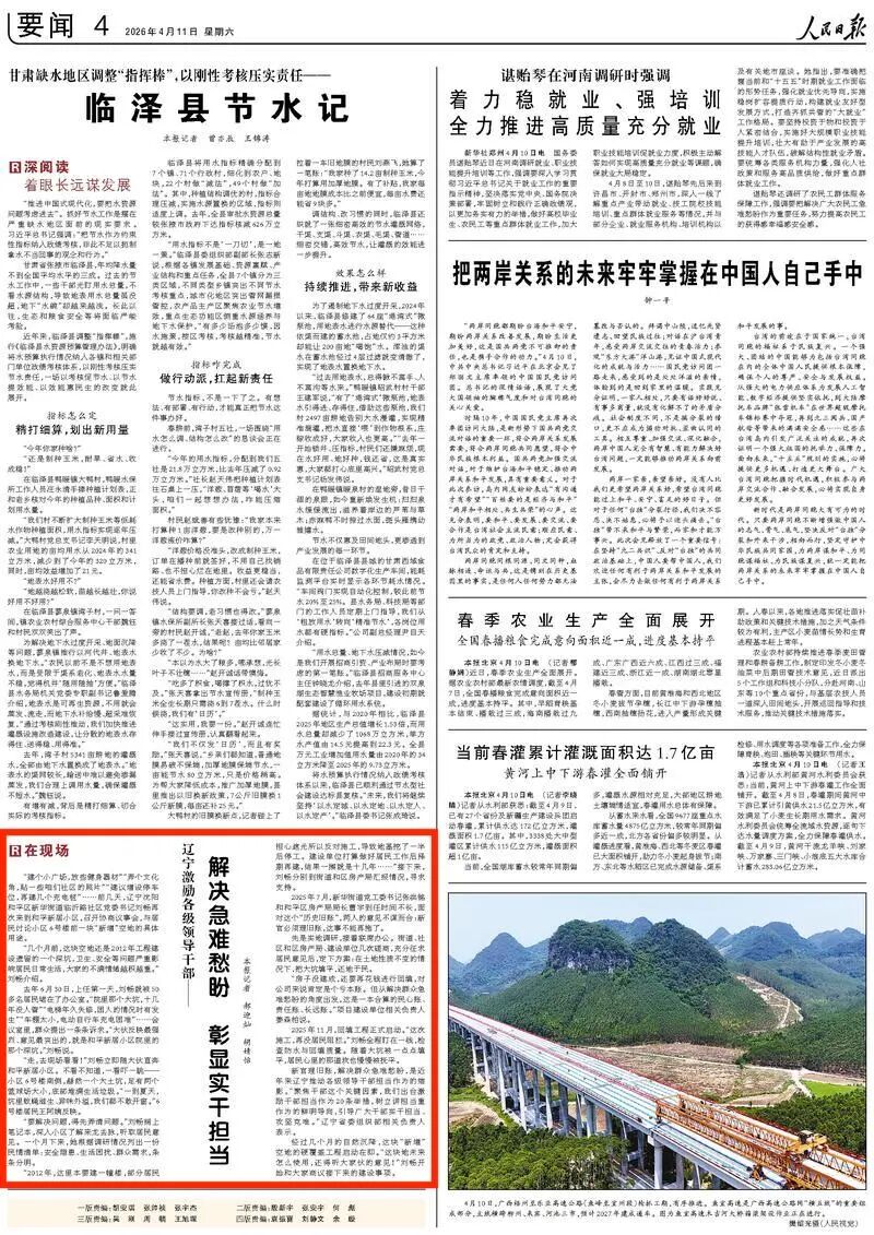 4月11日,人民日报第04版刊发《辽宁激励各级领导干部——解决急难愁盼 彰显实干担当(在现场)》称,新官理旧账,解决群众急难愁盼,是近年来辽宁推动各级领导干部担当作为的缩影。“聚焦干部这个关键因素,我们出台激励干部担当作为20条举措,树立讲担当重作为的鲜明导向,引导广大干部实干担当、攻坚克难。”辽宁省委组织部相关负责人表示。