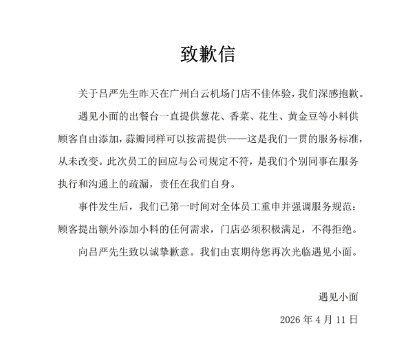今日(4月11日),中式快餐连锁品牌“遇见小面”发布致歉信: