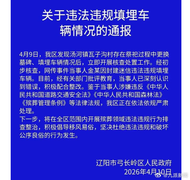 4月9日,我区发现汤河镇瓦子沟村存在祭祀过程中更换墓碑、填埋车辆情况后,立即开展核查处置工作。经初步核查,网传事件当事人金某因封建迷信违法违规填埋车辆。目前,经有关部门批评教育,当事人已深刻认识到错误,积极配合整改。鉴于当事人涉嫌违反《中华人民共和国道路交通安全法》《中华人民共和国森林法》《殡葬管理条例》等法律法规,我区正在依法依规严肃处理。