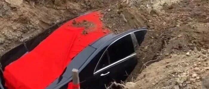 一座刚修好的墓碑旁边,有一辆挖掘机正吊起一辆黑色的奔驰汽车,众人合力将汽车推入挖好的墓坑。随后,车辆被埋入土中,疑似作为陪葬品下葬。