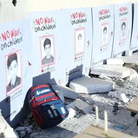 4月6日,在伊朗首都德黑兰市举行的悼念活动现场,组织者搭建起小学教室遭袭场景并摆放学生书包,悼念遭美以空袭遇难的米纳卜小学学生。新华社记者沙达提摄