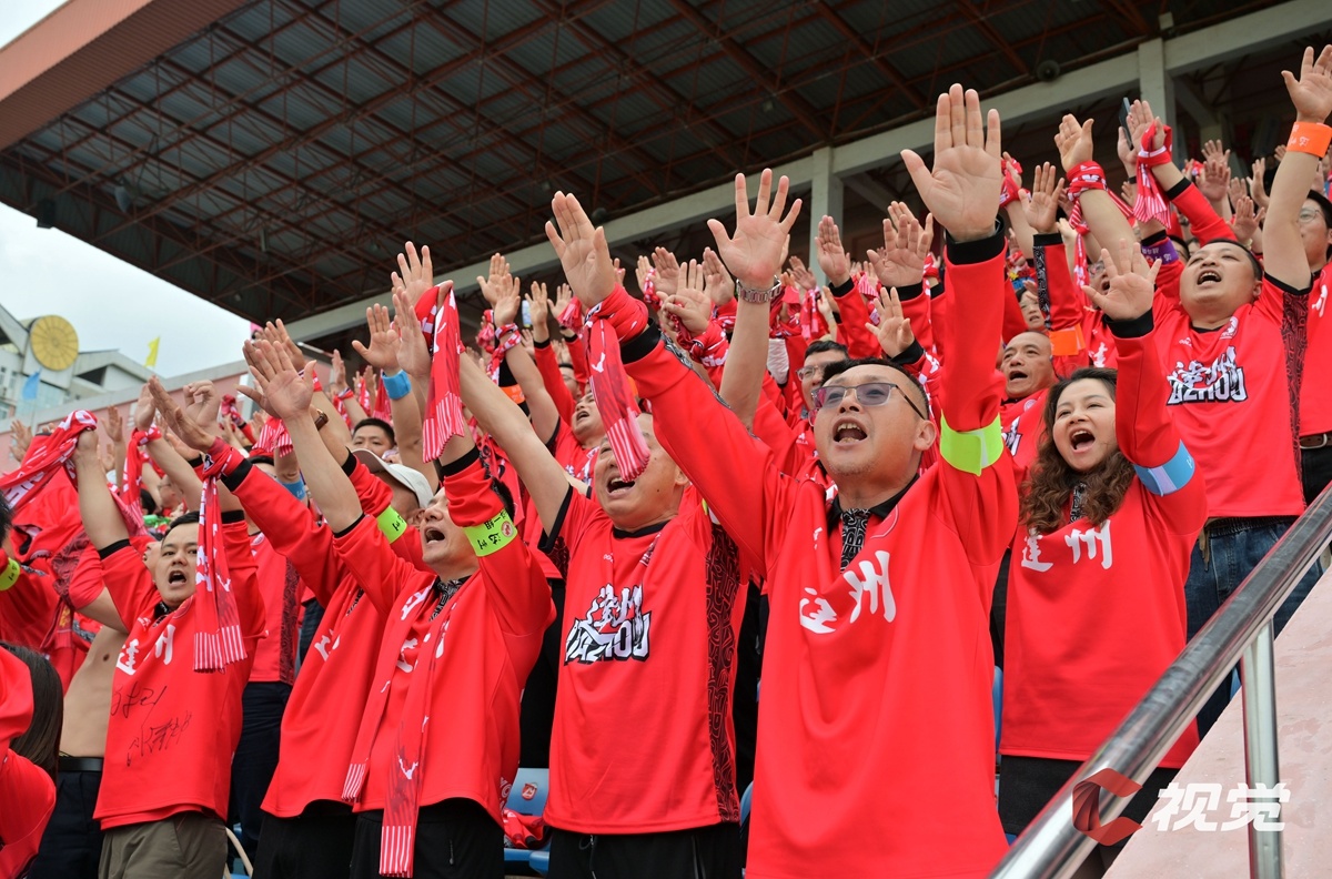4月11日下午,“川超”决赛阶段第五轮比赛,南充丝绸源点队主场迎战达州川汉子队。图为现场观赛的达州球迷为球队加油呐喊。C视觉签约摄影师 胡彤 摄